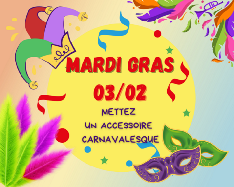 Par ELODIE LE STRAT, publié le vendredi 23 janvier 2026 11:13 - Mis à jour le lundi 26 janvier 2026 15:31Mardi 03/02, que vous soyez élèves ou adultes, mettez des paillettes dans cette journée : portez un accessoire carnavalesque... Pourquoi ne pas créer un dress code de classe??? -