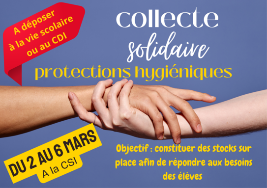 Collecte solidaire de protection hygiénique à la CSI pour lutter contre la précarité menstruelle du 2 au 6 mars.